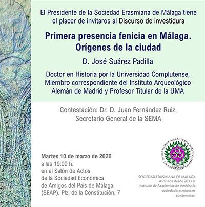 Discurso de ingreso en la Sociedad Erasmiana de Málaga (SEMA) de D. José Suárez Padilla –Doctor en Historia por la Universidad Complutense, Miembro correspondiente del Instituto Arqueológico Alemán de Madrid y Profesor Titular de la UMA–.